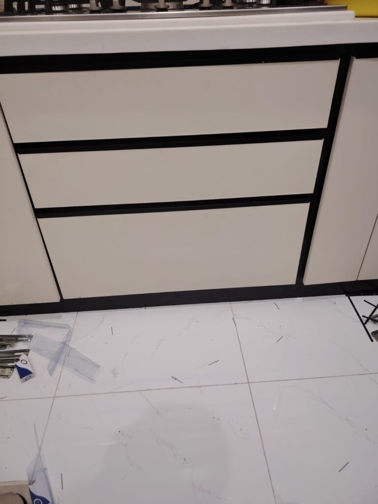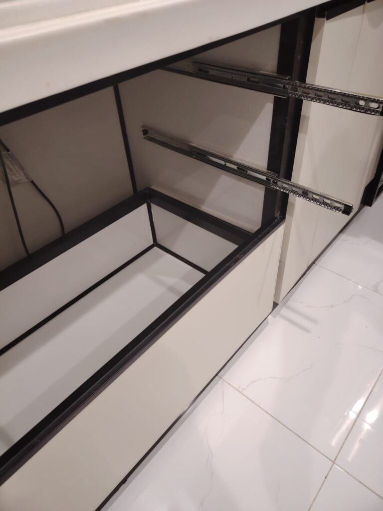 كما يتم اختيار المفصلات والمقابض بعناية لتكون مقاومة للرطوبة والحرارة وتُضفي مظهرًا أنيقًا وعصريًا على المطبخ.